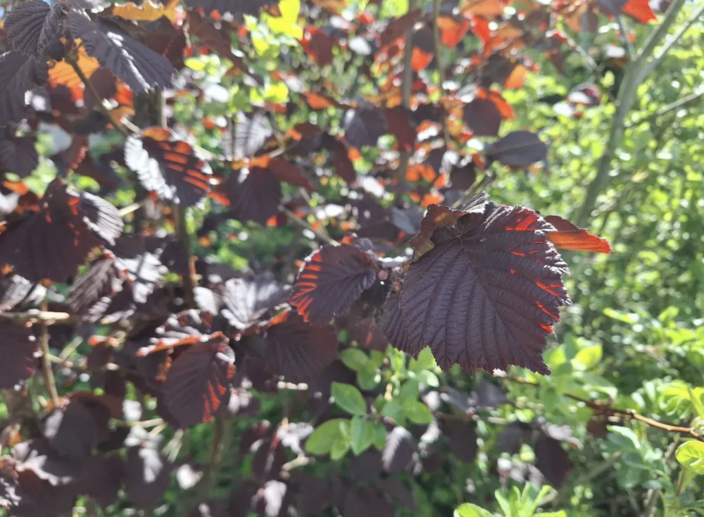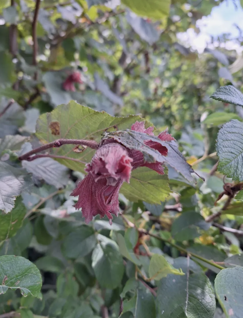 De ‘Rode Zellernoot’ is een sier- én voedselbosfavoriet: jonge bladeren lopen wijnrood uit, kleuren later purper/brons en verkleuren richting de nazomer groener—met in de late zomer/herfst noten in paarsrode omhulsels. Het is een krachtige, gezonde struik die tegelijk decoratief en productief is.