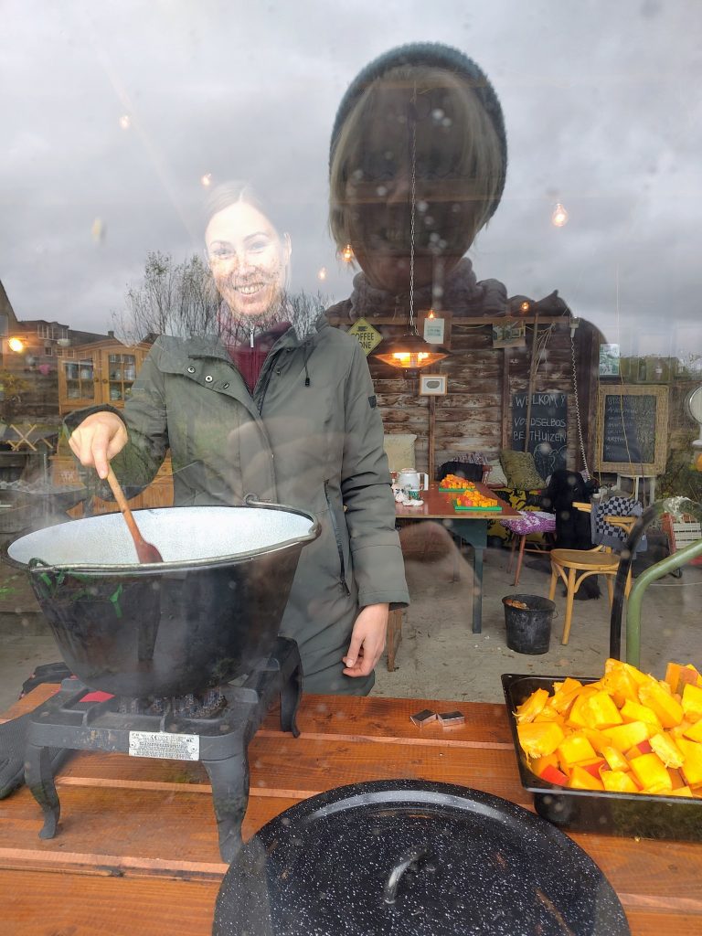 Samen met een groep vrijwilligers verwerkten we kilo’s vruchtvlees tot lekkere jam en genoten we tussendoor van een heerlijke pan soep gemaakt van een reuzenpompoen 🎃.