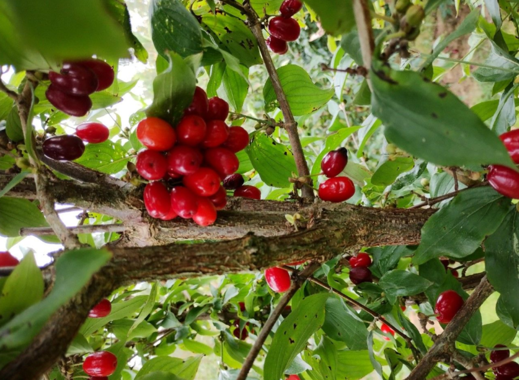 Gebruik voor dit recept uitsluitend de gele kornoelje (Cornus mas). Verwar deze niet met zijn neefje, de rode kornoelje (Cornus sanguinea); die bessen zijn namelijk niet eetbaar. Wil je het hele seizoen door kunnen oogsten? Combineer dan verschillende rassen in je voedselbos. Met een mix van de ‘Elegantnyj’ (vroeg), ‘Schönbrunner Gourmet-Dirndl’ (midden) en ‘Pioneer’ (laat) geniet je maandenlang van verse “olijven”.